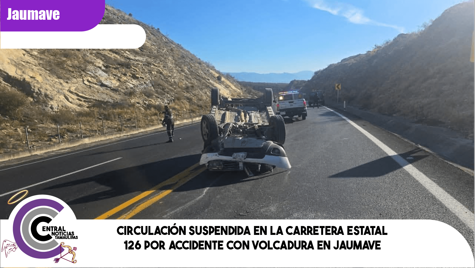 La circulación vehicular se encuentra suspendida en ambos sentidos a la altura del kilómetro 134 de la Carretera Estatal 126, tras registrarse la volcadura de un vehículo particular.