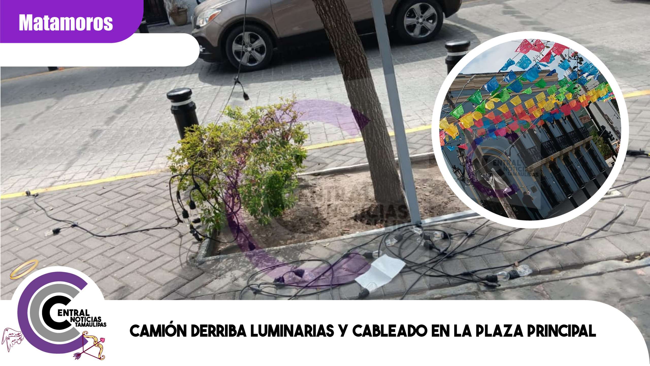 Matamoros, Tamaulipas.- Un camión de la empresa Corali provocó daños en la plaza principal luego de derribar focos y cables mientras circulaba sobre la avenida Morelos, en dirección de poniente a oriente.