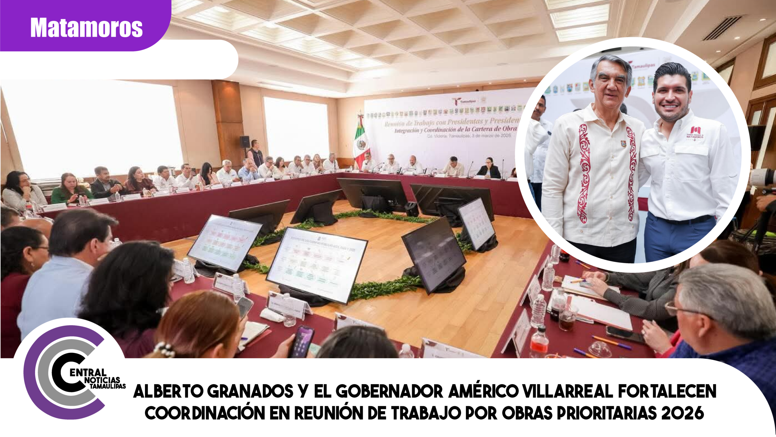 Matamoros, Tamaulipas.– El alcalde de Matamoros, Alberto Granados, sostuvo una reunión de trabajo con el gobernador de Tamaulipas, Américo Villarreal, en el Palacio de Gobierno de Ciudad Victoria, donde se llevó a cabo la recepción formal de la Cartera de Proyectos Prioritarios de Obra Pública 2026.