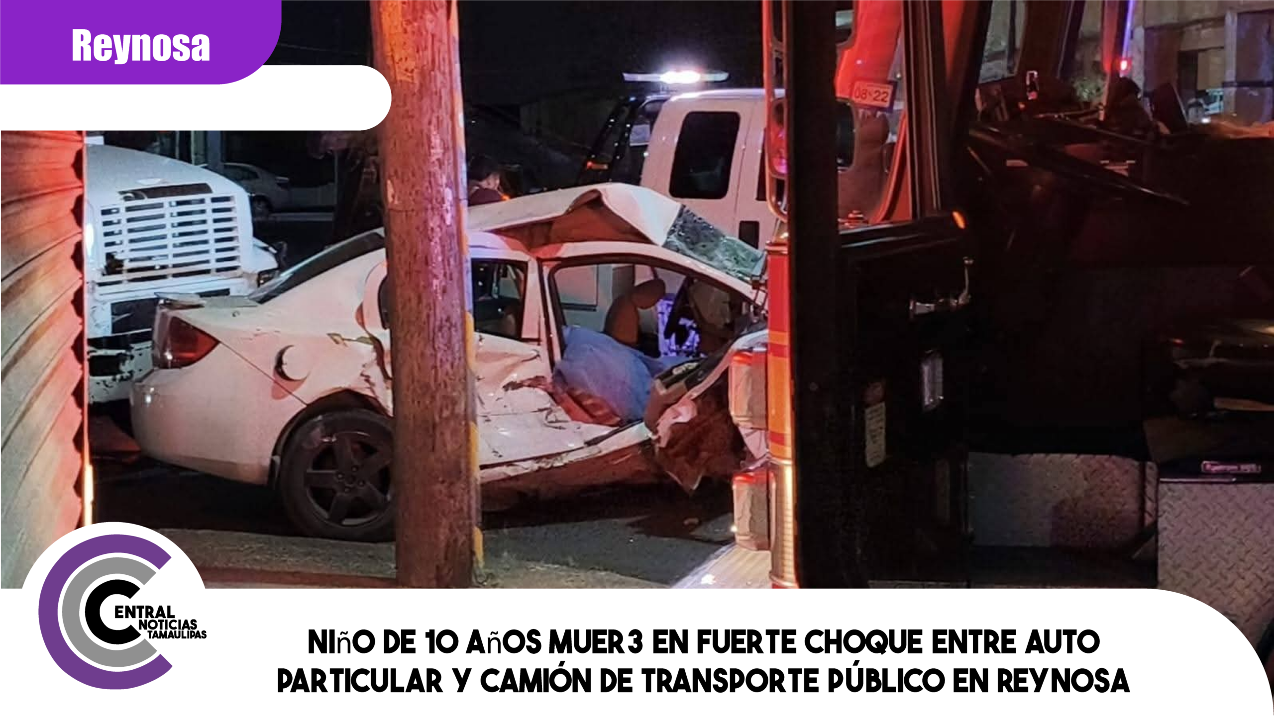 Niño de 10 años muer3 en fuerte choque entre auto particular y camión de transporte público en Reynosa