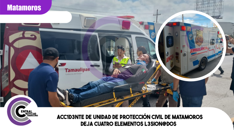 Matamoros, Tamaulipas.- Un percance vial registrado sobre la avenida Lauro Villar, a la altura de Ciudad Industrial, dejó como saldo cuatro personas lesionadas, entre ellas personal de Protección Civil.
