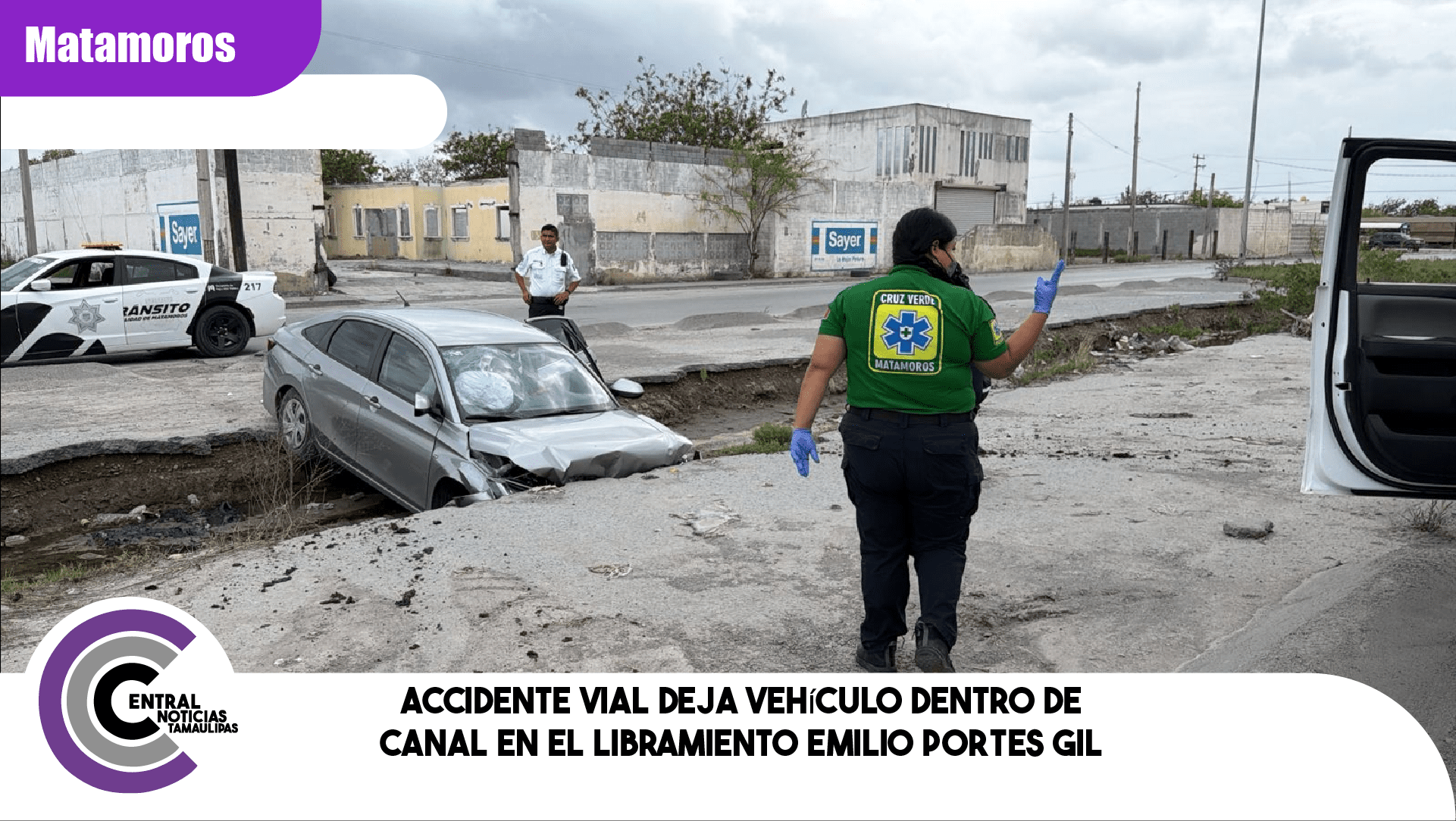 Matamoros, Tamaulipas.- Durante la tarde de este sábado, se registró un accidente vehicular sobre el Libramiento Emilio Portes Gil, a la altura de Bodega 2000, donde una unidad motriz salió del camino y terminó dentro de un canal.