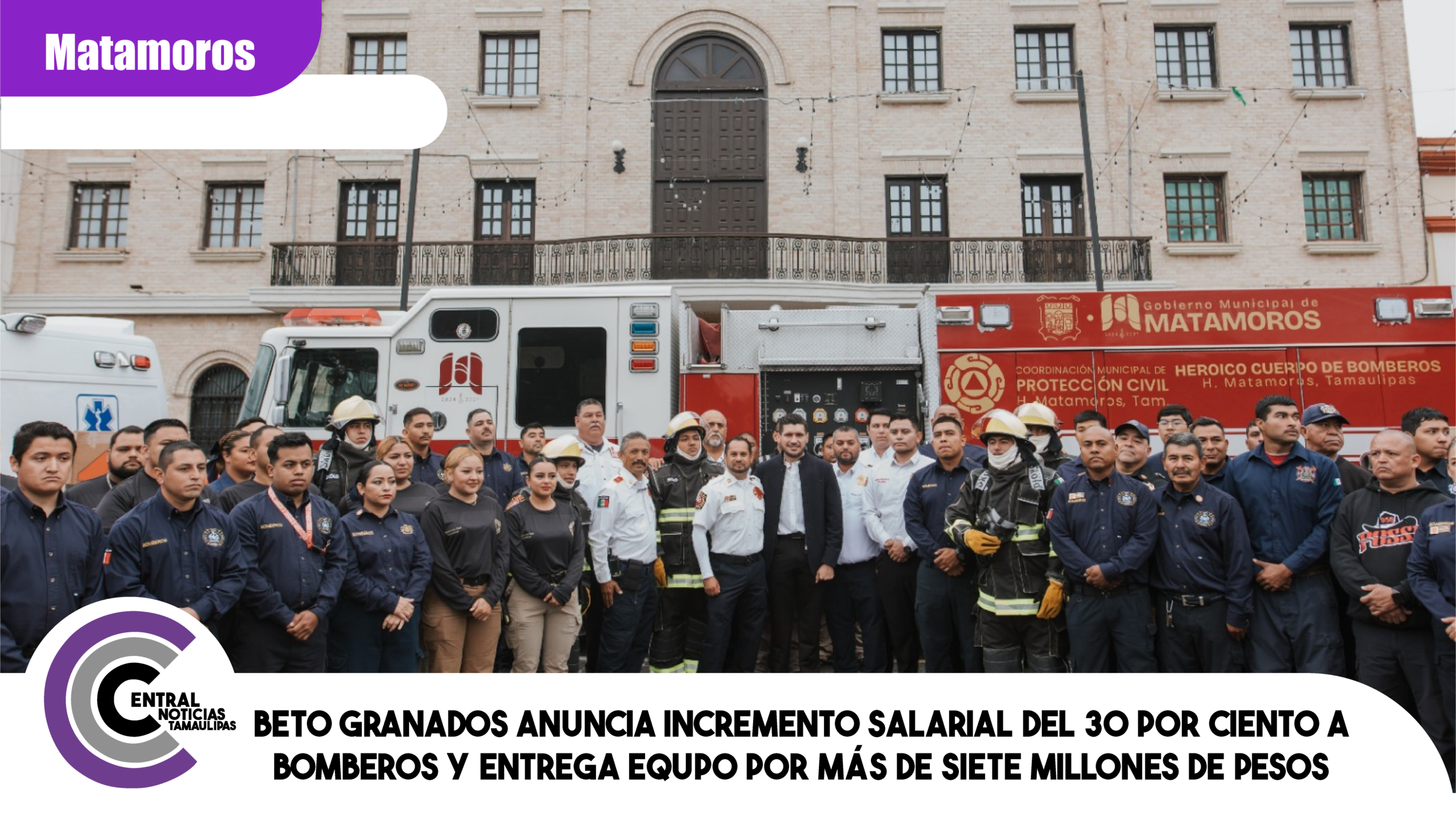 H. Matamoros, Tamaulipas.- El alcalde Beto Granados, en un acto de justicia para el Heroico Cuerpo de Bomberos, hizo entrega de equipo personal, cuatro unidades motobomba y una ambulancia donada por la empresa Orbia, que en conjunto suman más de 8 millones de pesos. Además, anunció un incremento salarial del 30 por ciento para todo el personal de Protección Civil.