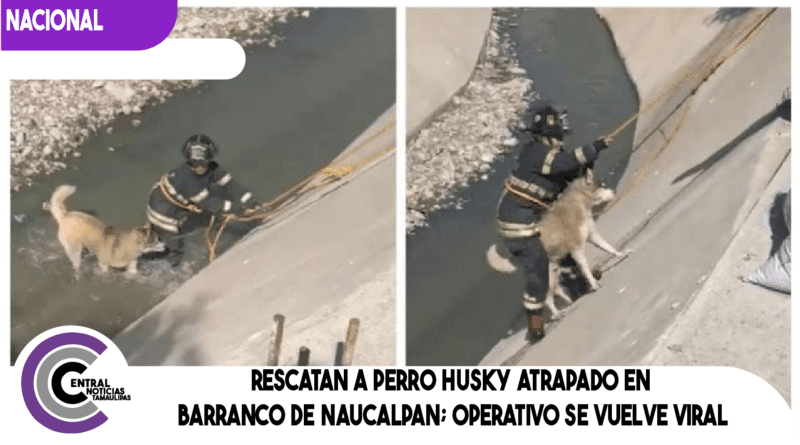 Naucalpan, Estado de México.– Elementos de Protección Civil y Bomberos de Naucalpan realizaron el rescate de un perro de raza husky siberiano que había quedado atrapado en un barranco dentro de un cauce, en la colonia Boulevares.